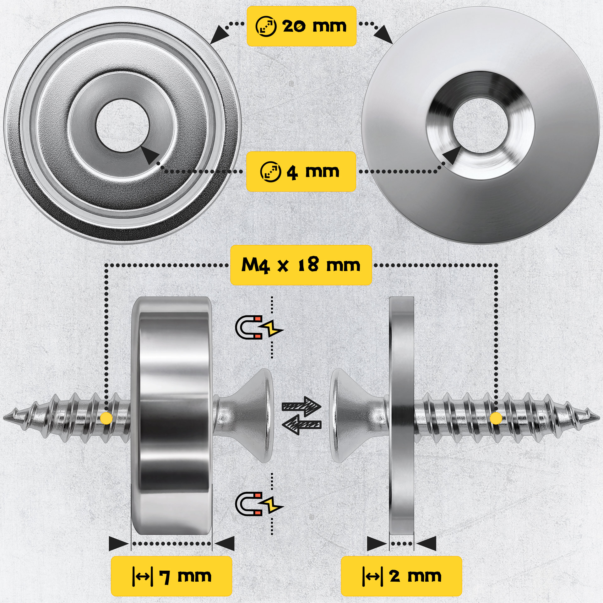 W zestawie z magnesami znajdują się wkręty o rozmiarze 4×18 mm oraz podkładki stalowe.